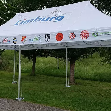 The discreetly printed 3×3 m pop up gazebos can be equipped with side panels for flexible use. The design attracts visitors during the events, without distracting them too much from the beautiful nature surrounding them. In addition, a printed Flag attracts attention.