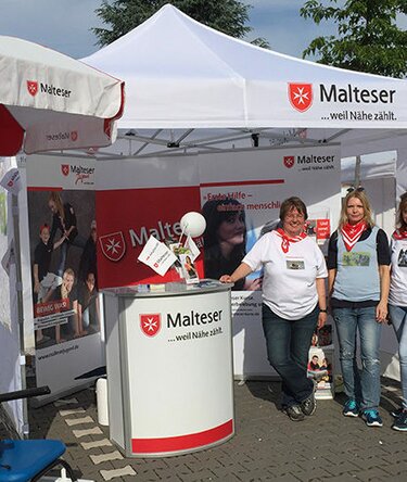 Well protected from the weather underneath a printed pop up gazebo 3×3 m with panorama sidewalls, the members of the Order of Malta answered countless questions of curious visitors. Our Rondo counter served as information point and offered plenty of flyers and brochures. A Circle Flag complemented the presentation and attracted the people from afar.